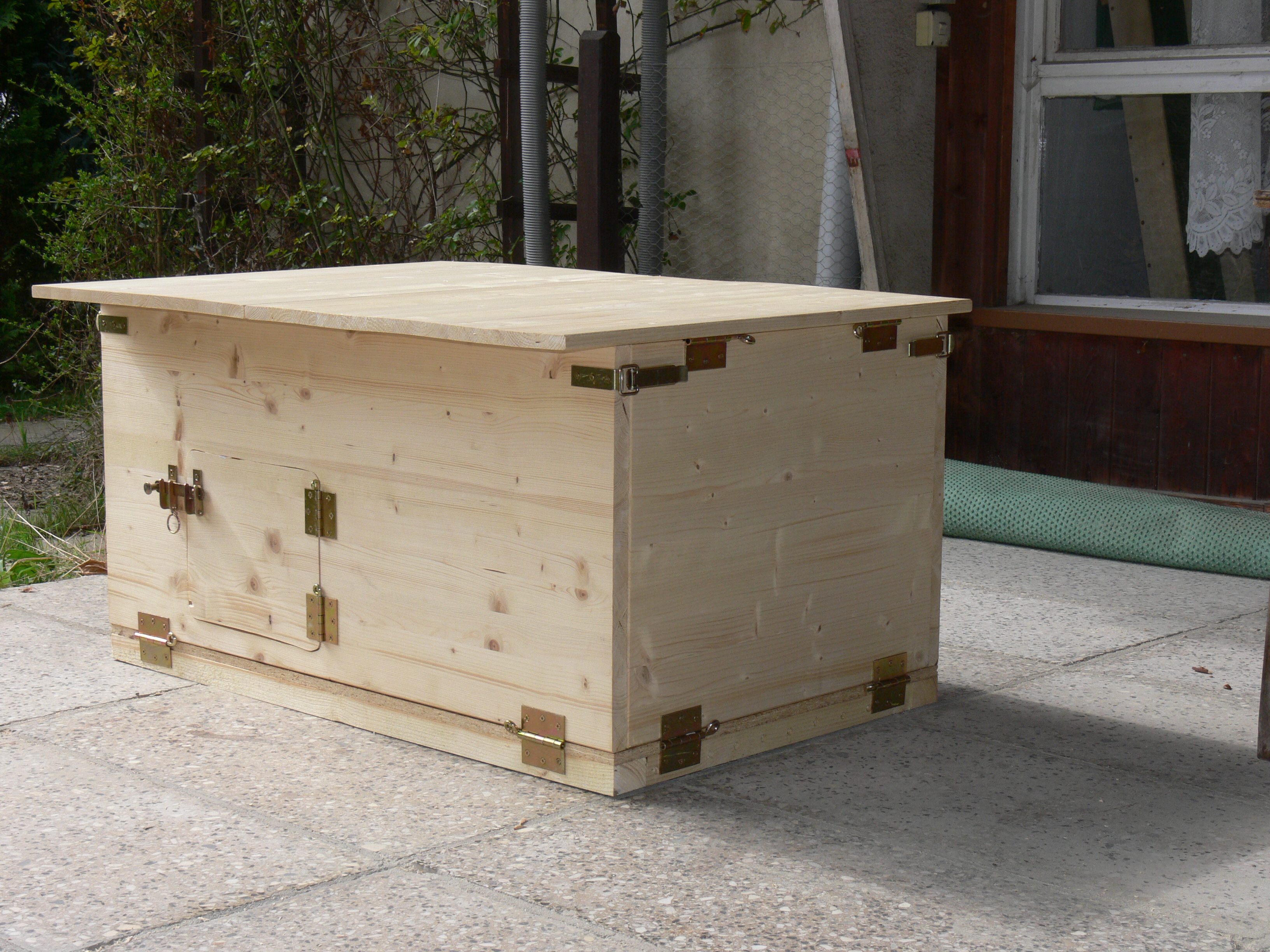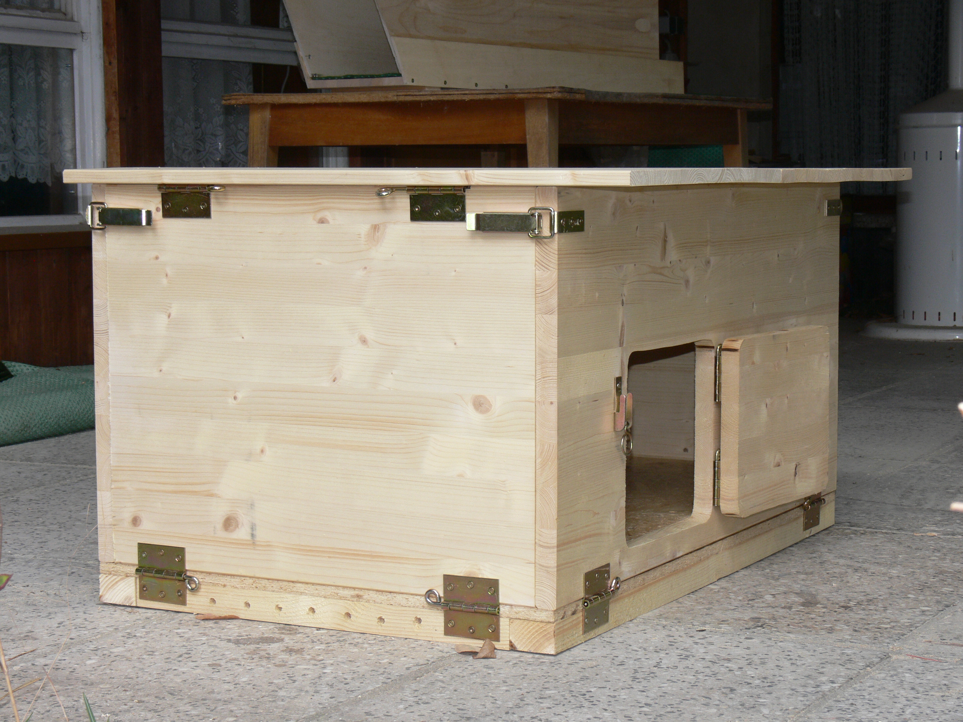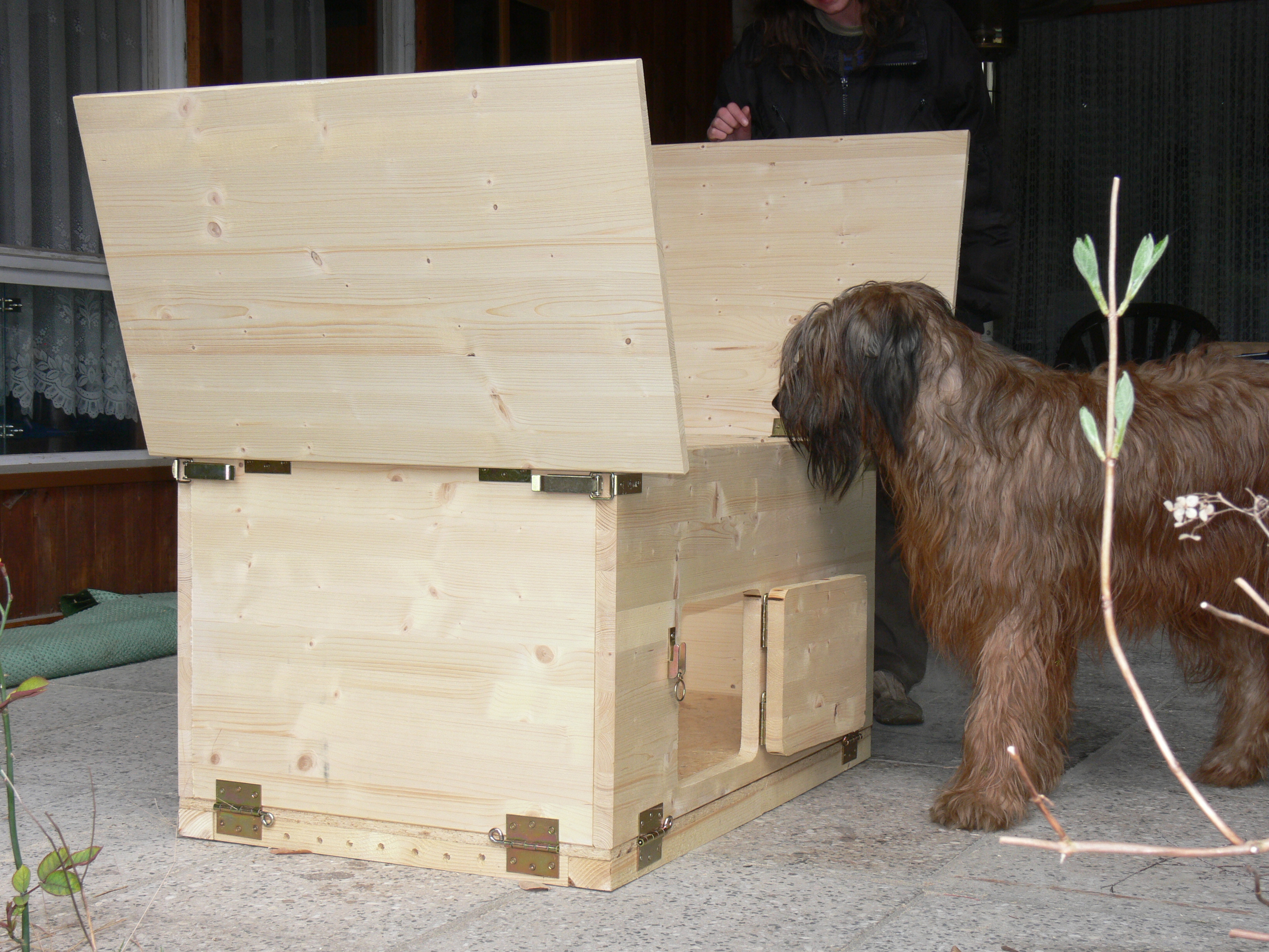 Damit die Welpen bei kühlem Wetter nicht immer ins Haus verfrachtet werden müssen, sobald sie einschlafen, ist ein Welpenhaus für die Terrasse entstanden. Gebaut nach bewährten Prinzipien, von Lilith bereits einmal inspiziert.