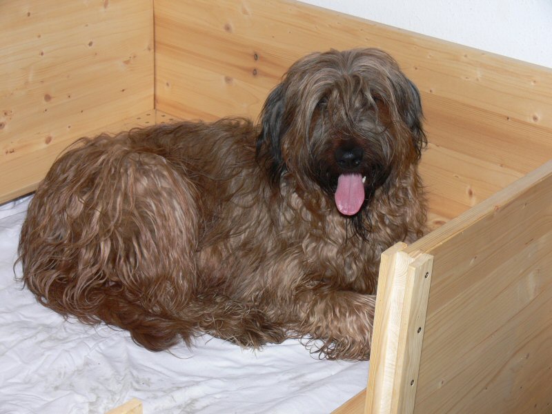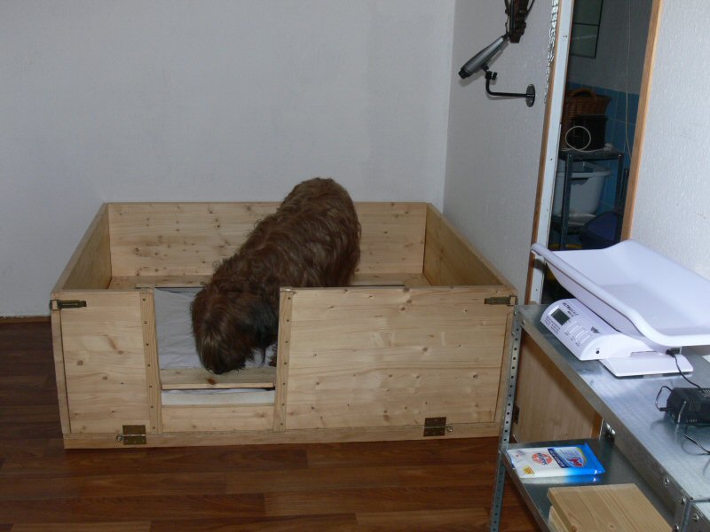 Das Wurfzimmer ist wieder vorbereitet und desinfiziert. Das ist wichtig, da die Welpen ihren Immunschutz erst nach einigen Tagen aufzubauen beginnen. Lilith hat ihre Wurfkiste begutachtet und offenbar auch dieses Mal wieder für gut befunden.