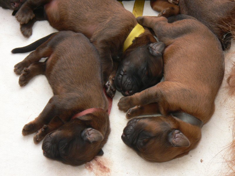 In den ersten Tagen tun die Welpen nichts außer nur außer trinken und schlafen. Seit gestern abend haben sie im Schnitt 10% zugenommen und bringen jetzt zusammen 4 Kilogramm auf die Waage. Am meisten hat sich Braun gesteigert, der ja auch etwas aufholen muß.
