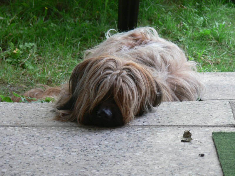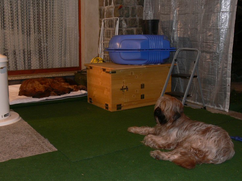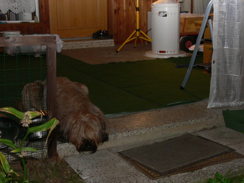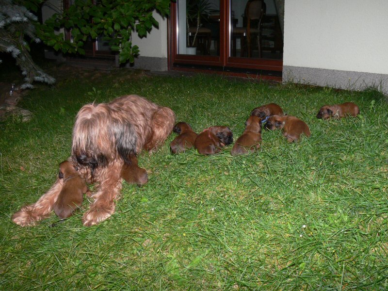 Gestern abend hatten wir den ersten Ausflug ins Gras und auf die Terrasse. Unter der Gasheizung wird den Welpen nicht kalt.