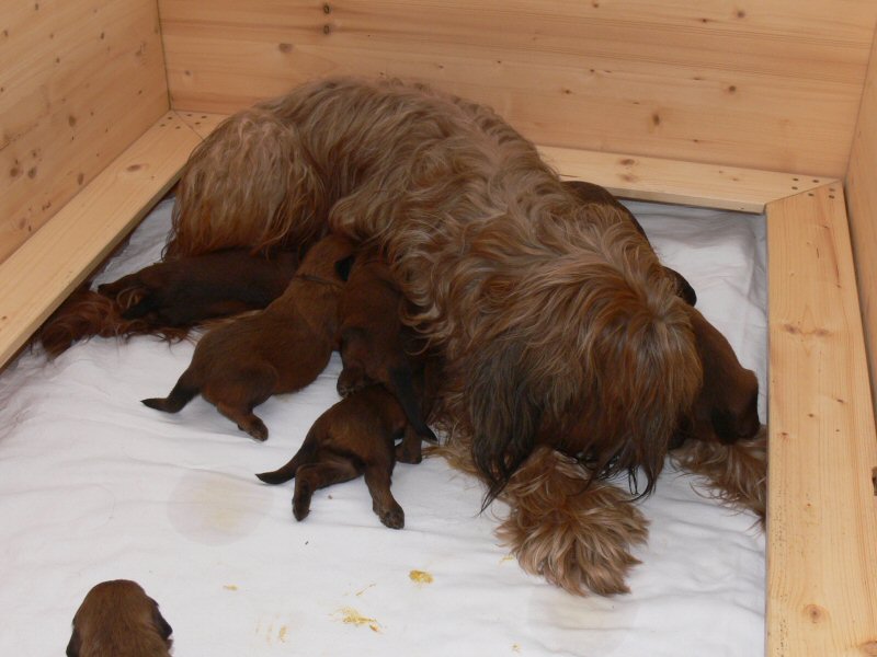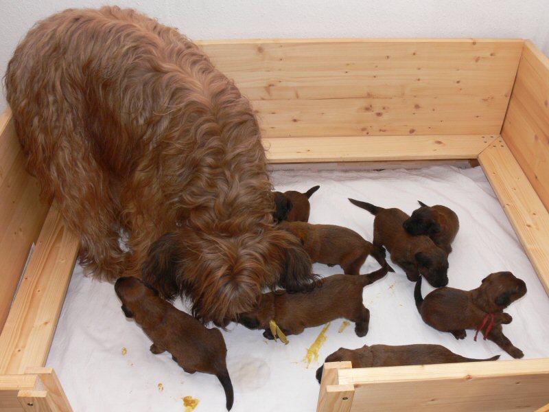 Lilith hat jetzt Erfahrung im Betreten der Kiste voller Welpen. Beim ersten Wurf hat sie uns dabei öfter um Hilfe gebeten. Nun balanciert sie in die Kiste, steht dabei manchmal scheinbar nur auf zwei Beinen und lockt den Schwarm Welpen hinter sich her, um sich dann geschwind am gegenüberliegenden Ende der Kiste niederzulassen.