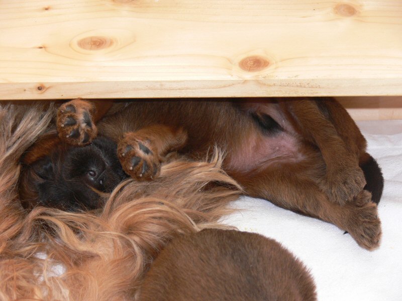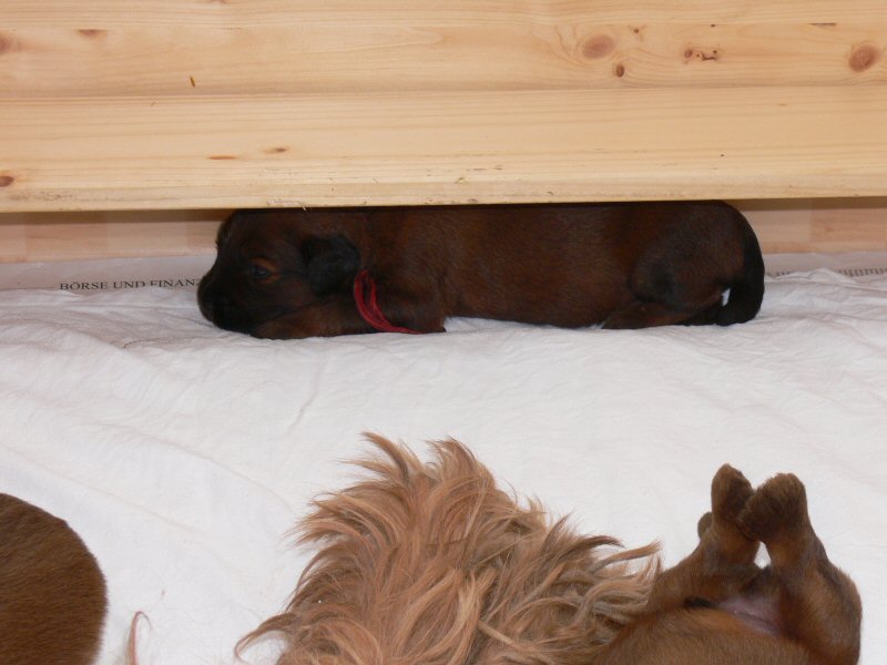 Lilith geht nachts nur noch gelegentlich zu den Welpen, um nach dem Rechten zu sehen. Dunkelgrün hat Lilith und uns vergangene Nacht durch lautes Geschrei geweckt. Er hat es als erster geschafft, den halbhohen Ausgang der Wurfkiste zu überwinden, lag auf dem Fußboden und fühlte sich dort kalt und einsam.