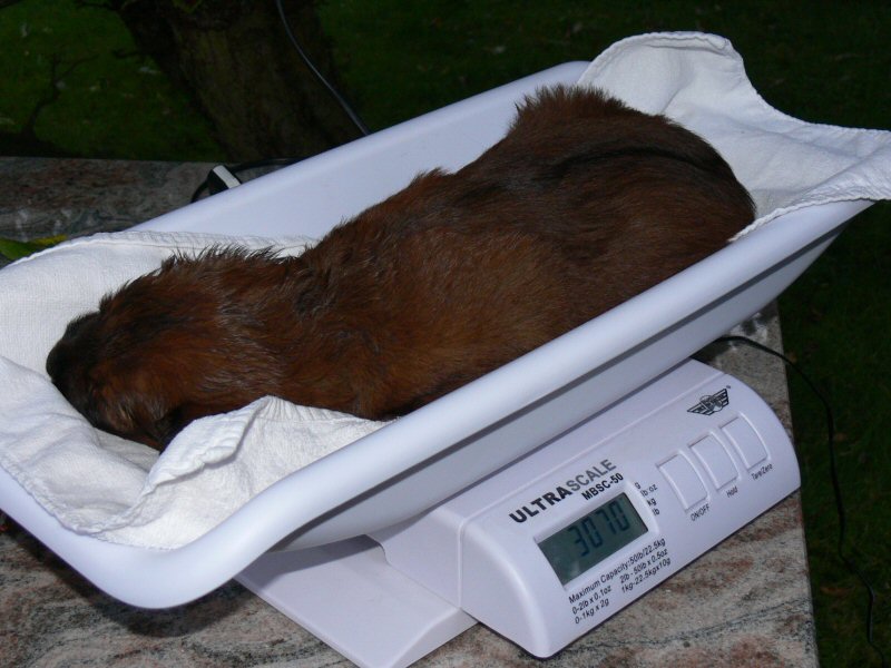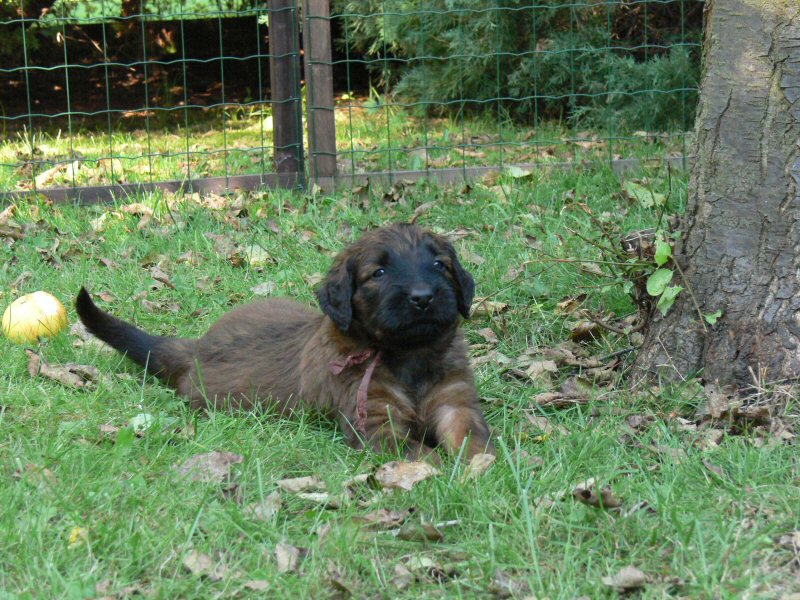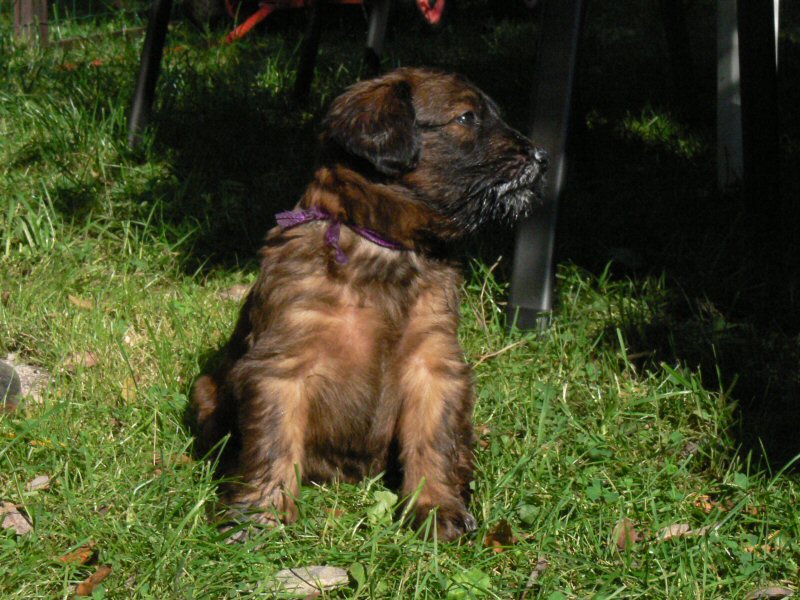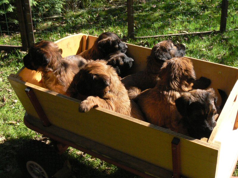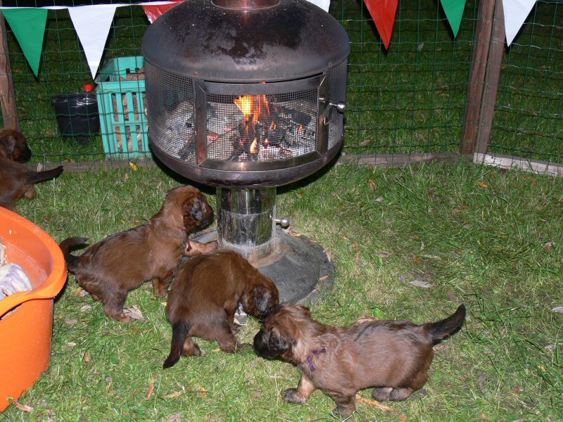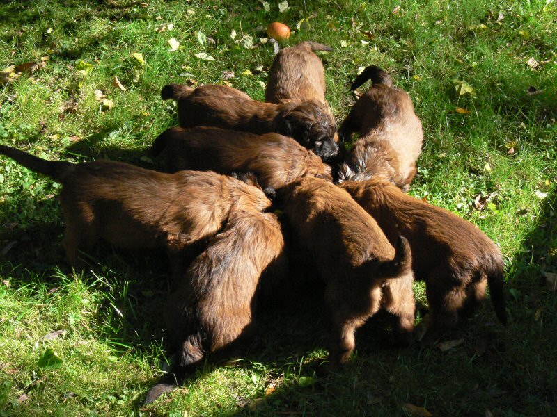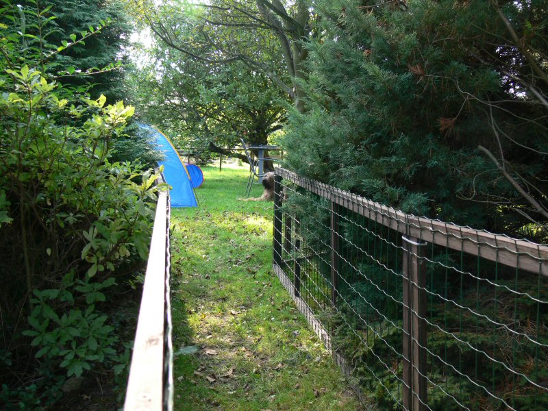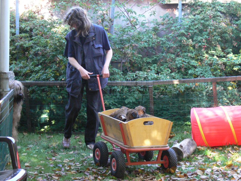 Weil das Wetter gerade so schön ist, haben wir die Spielwiese diesmal etwas früher in Benutzung genommen als beim A-Wurf. Die Spielwiese mit Gras, Erde und Bäumen ist im hinteren Teil des Garten eingezäunt. Die Welpen folgen schon, wenn man sie durch den schmalen Gang ums Haus herum dorthin lockt. Wenn es schneller gehen soll, lädt man sie besser in einen Wagen.