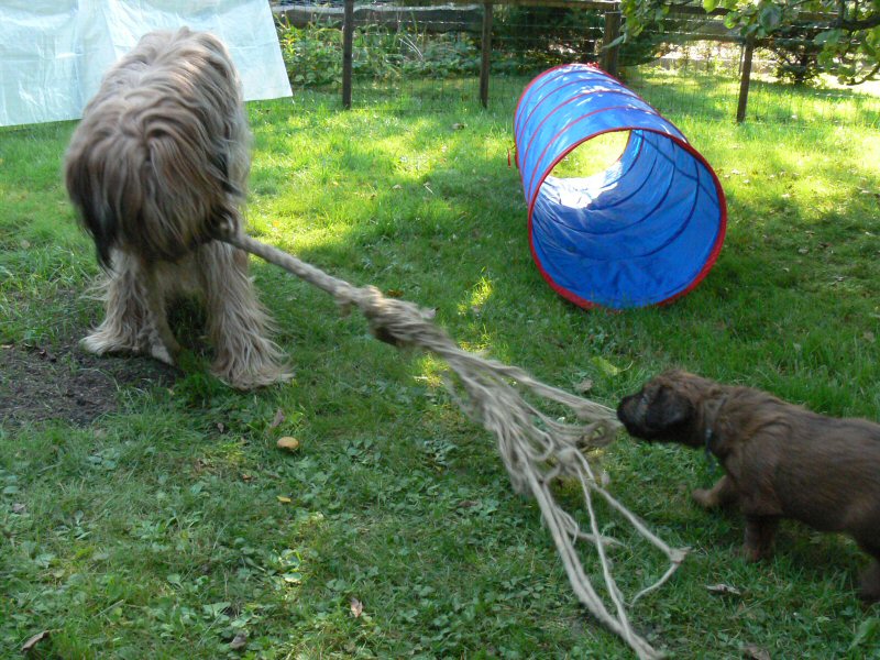 Wo mehr Platz ist, ergeben sich auch neue Spielmöglichkeiten mit Seilen und Tunneln. Jetzt kann auch Anna Karenina ihre Vorstellungen vom Spielen langsam umsetzen. Die Welpen beginnen schon gemeinsame Unternehmungen, zum Beispiel eine Decke stehlen und herumziehen. Lilith spielt jetzt ebenfalls mit ihren Welpen, was natürlich Teil von deren Hundeausbildung ist.