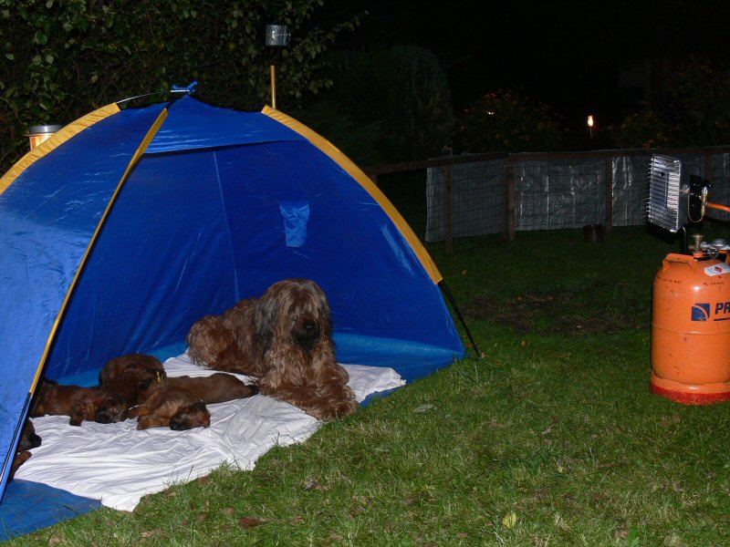 Abends wird es kühl und feucht, daher ist das Schlafzelt der Welpen etwas geheizt.