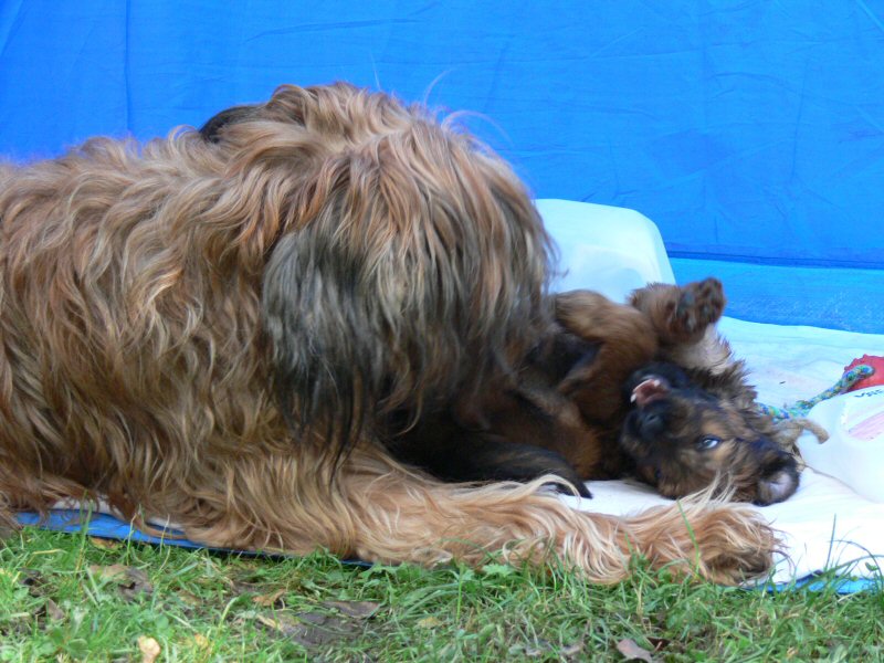 Lilith und Anna Karenina haben sich jetzt arrangiert. Sie teilen sich die Betreuung und Erziehung der Welpen. Das funktioniert sehr gut und inzwischen ohne Eifersucht oder andere Vorbehalte seitens Lilith. Schließlich macht ihr die Arbeitsteilung das Leben auch etwas leichter.