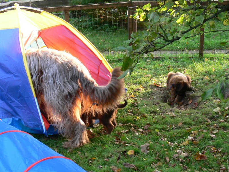 Anna hat es geschafft, im Garten ein großes Loch zu graben. Frauchen war entsetzt, die Welpen dagegen entzückt. Kaum zu glauben, was man als Welpe mit solch einem Loch alles anfangen kann.