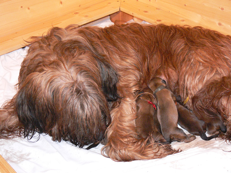 Es war wieder der 60. Tag von Liliths Trächtigkeit und wie beim B-Wurf begann Lilith früh um zehn, gleich nach dem Frühstück. Diesmal hat es kaum drei Stunden gedauert, bis alle Welpen da waren: fünf Mädchen und zwei Jungen, denen es allen offenbar prächtig geht. Ein achter Welpe wurde tot geboren.