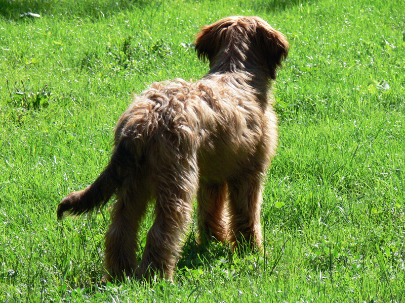 Ich habe schon viel gelernt: hinsetzen, hinlegen, kommen, wenn ich gerufen werde (auch aus weiterer Entfernung), beim Rudel bleiben, Hühner erschrecken (offenbar unerwünscht), Ball bringen und so weiter. Vieles mache ich den Großen einfach nach. Ich unterstütze ein wenig bei der Gartenarbeit (durch Aufpassen und verdächtige Bewegungen beim Nachbarn melden, was allerdings auch nicht gewünscht ist) und bekomme gelegentlich ein getrocknetes Schweineohr als Zwischenmahlzeit.