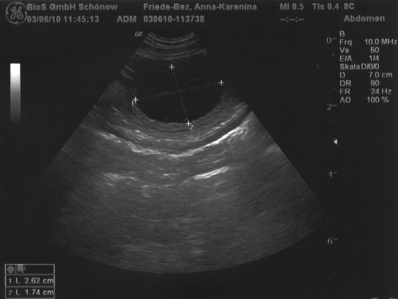 Das Ultraschallbild heute früh hat Gewißheit gebracht, daß Anna Karenina trächtig ist. Drei Fruchtblasen (im Bild als schwarze Ovale zu sehen, einmal ist auch die Größe gemessen) waren zu erkennen. Das heißt aber nicht, daß nur drei Welpen zu erwarten sind. Es können auch durchaus doppelt so viele werden.