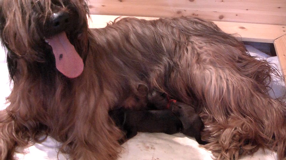 Es bleibt ein übersichtlicher Wurf. Das dritte Echo, das wir im Ultraschall zu sehen meinten, war also eine Täuschung. Wir freuen uns über zwei putzmuntere Welpen und Mutter Anna Karenina ist sehr stolz. Uns scheint, daß Anna, der Kindskopf, auf einmal erwachsen geworden ist.