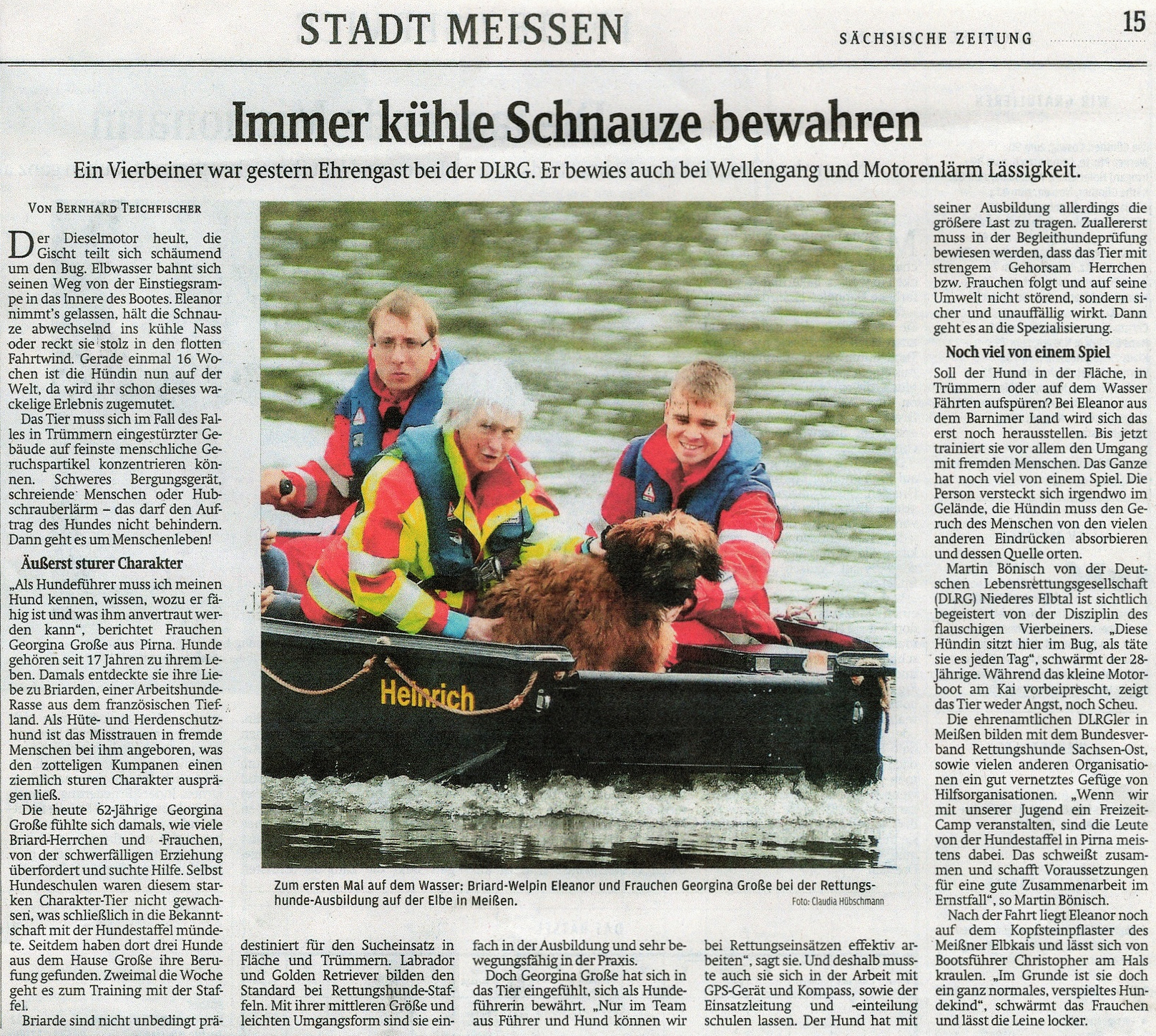 Mit freundlicher Genehmigung der Sächsischen Zeitung geben wir hier einen Artikel über Eleanors Schnupperauftritt bei der Deutschen Lebens-Rettungs-Gesellschaft (DLRG) wieder.