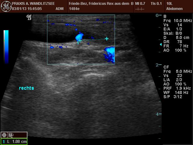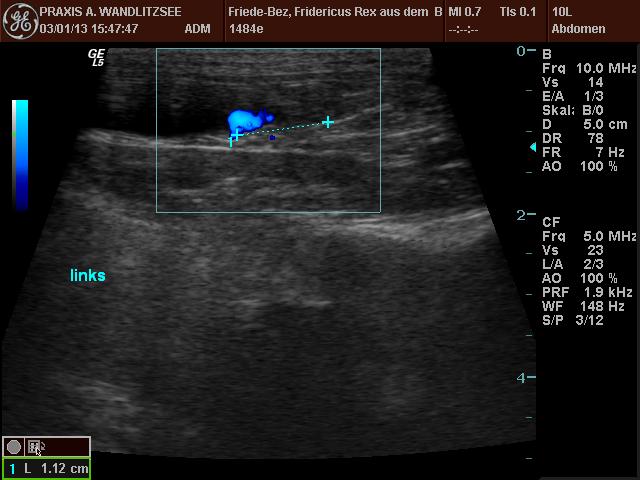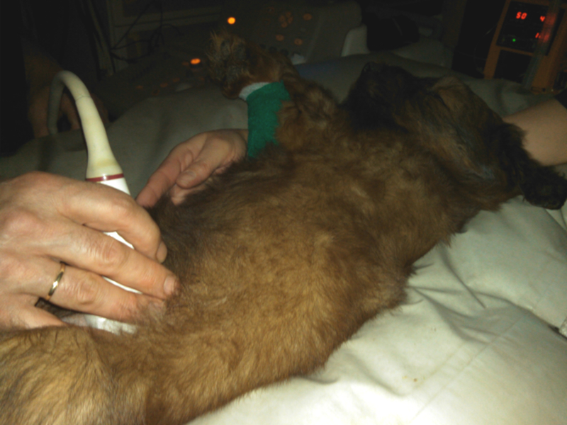Die Ultraschalluntersuchung hat ein wenig länger gedauert als erwartet, da das harntreibende Mittel offenbar einige Zeit brauchte, seine Wirkung zu entfalten. Dann waren aber schöne "Jets" zu sehen, und zwar da, wo sie sein sollten. Grund zur Freude also. Welpi wurde die Zeit lang und er schlief ein, während der Doktor ihm mit dem Sonar über den Bauch fuhr.