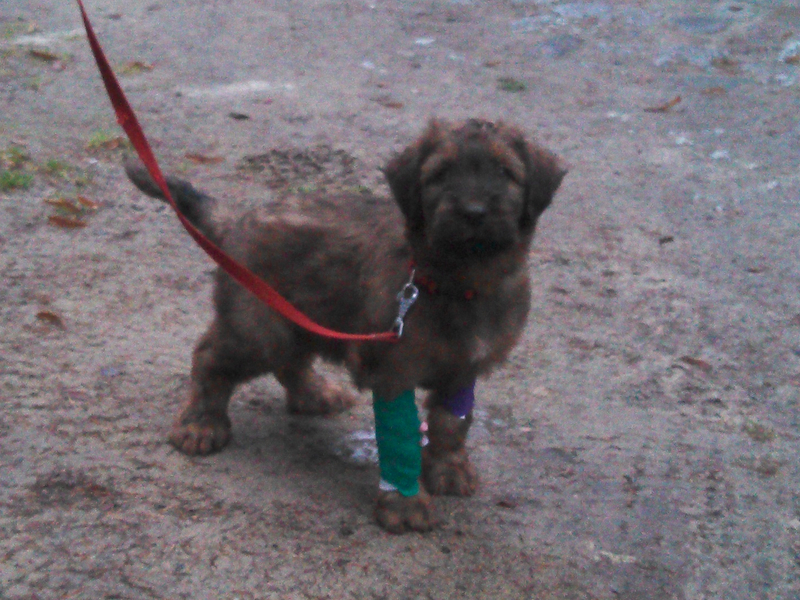 Beim Wasserlassen draußen vor der Tür – gleich eine Gelegenheit, die Leine zu üben – konnte er dann stolz seinen Verband präsentieren.