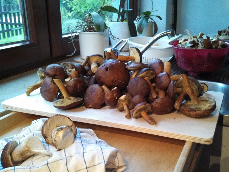 Abseits der Wege durch den Wald toben zu können, wenn Pilze gesammelt werden, finden unsere Hunde natürlich toll. Nach einer Weile, wenn sie etwas von der angestauten Kraft herausgelassen haben, fällt ihnen aber ihre gute Erziehung wieder ein und sie streben auf den Weg zurück, wie sie es gelernt haben. Treten dann dort von einer Pfote auf die andere und beobachten mit leiser Ungeduld unser Fehlverhalten. Und legen sich schließlich hin, wenn es mal wieder etwas länger dauert. Hütehunde.