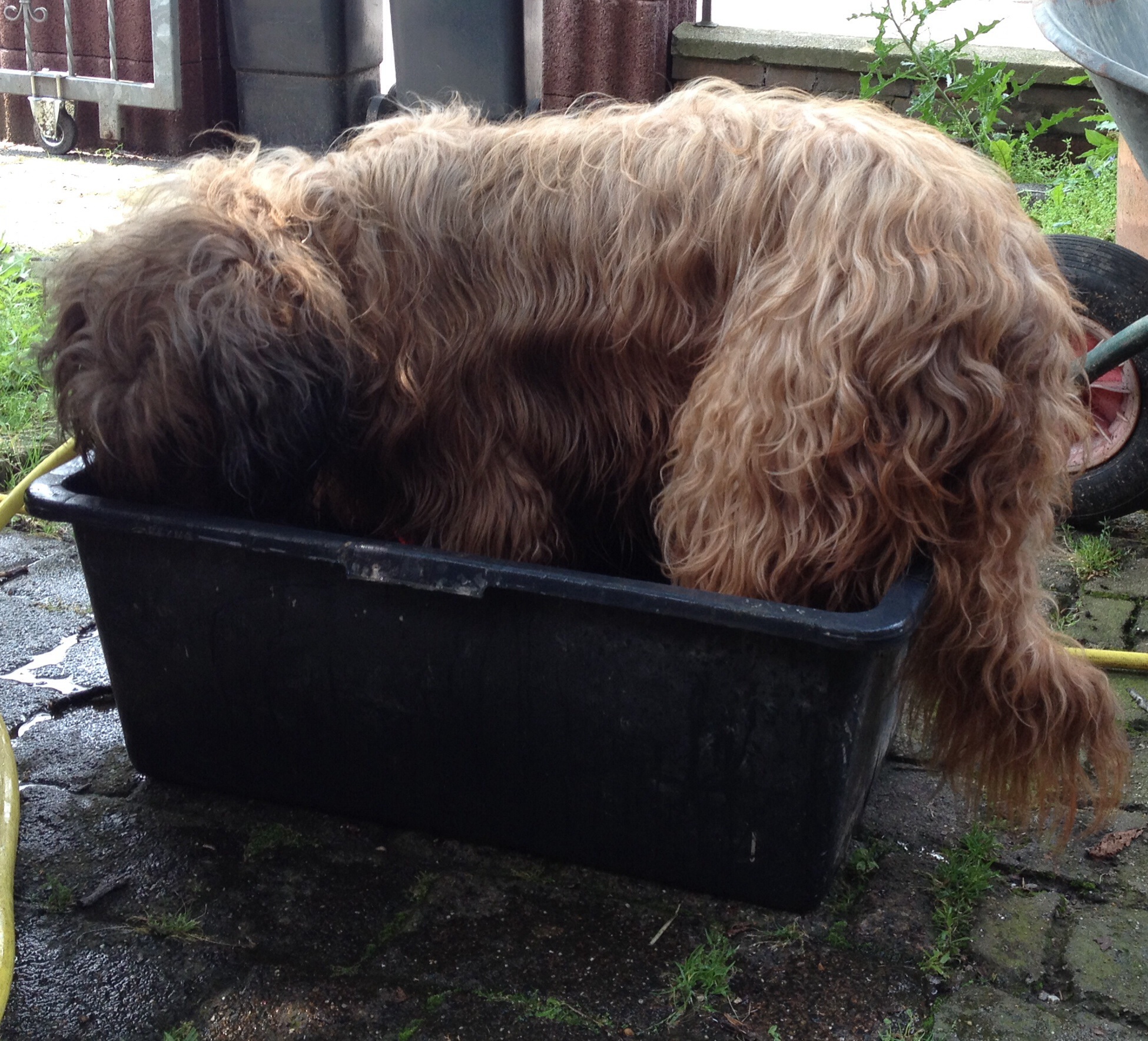 .... der schwarze Back ist echt prima und nicht so empfindlich 😊 wenn mal drin gebuddelt wird macht es ihm nichts aus. Hier ist er zur Abkühlung nach unserer Radtour . Ganz liebe Grüße zurück !!!