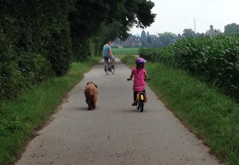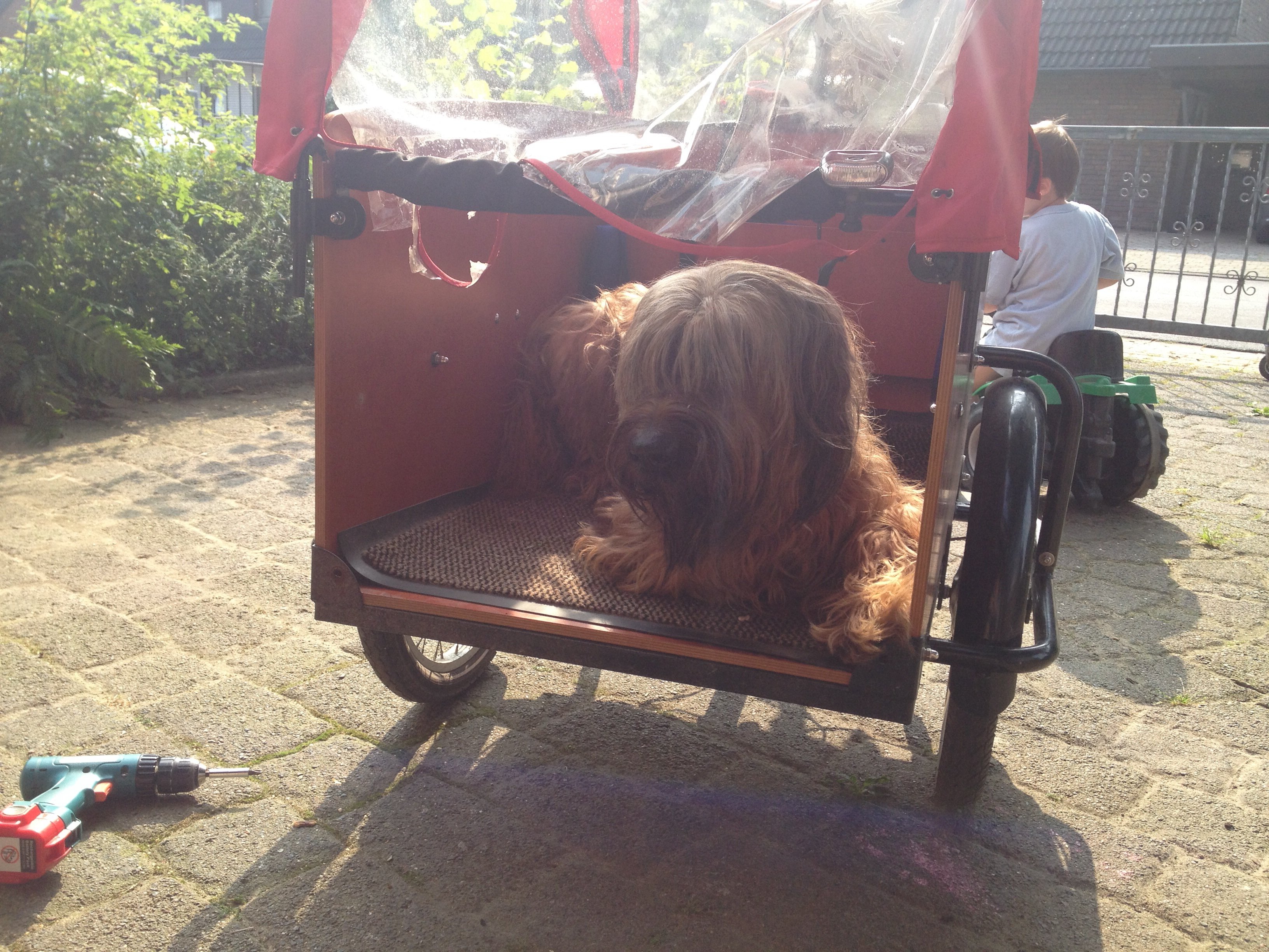 Hallo, meine kleine Freundin fährt nun fleißig Fahrrad und der kleine Mann ist ziemlich flott mit seinen Laufrad unterwegs. Das ist prima für mich, denn unsere Runden sind mal schnell und mal sehr langsam, so dass ich und die Zweibeiner jede Blume anschauen können. Naja, mal ehrlich ;-) meist geht das Tempo von den Zwergen aus... Aber mir gefällt es! Ab und an muss an einer schönen Wiese auch noch Ball gespielt werden. Da nun unser Lastenrad nicht mehr immer voll besetzt ist wird es jetzt für mich angepasst. Noch lauf ich die Strecken gern und gut mit, aber an viel befahrenen Straßen oder auch wenn ich kurz vorm Kindergarten warten muss kann ich nun im Babboe mich einrollen . Vorn ist dann eine Klappe die noch nicht ganz fertig ist zum aus- und einsteigen. Frauchen meint auch immer, wenn ich nicht mehr so kann dann darf ich trotzdem so dabei sein.... das dauert hoffentlich noch. Liebe Grüße und schnuff und wuff aus dem heute recht warmen Rumeln!