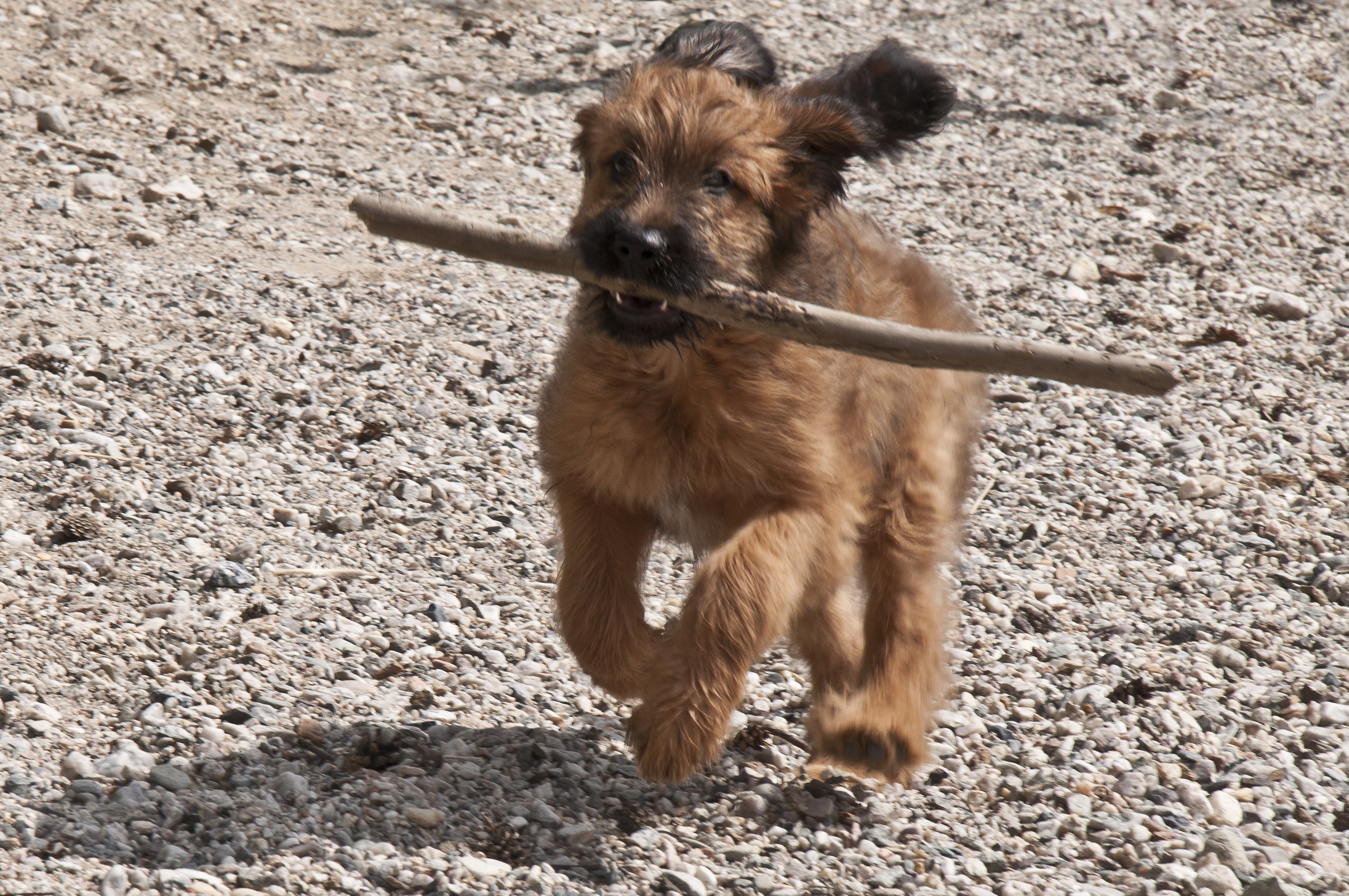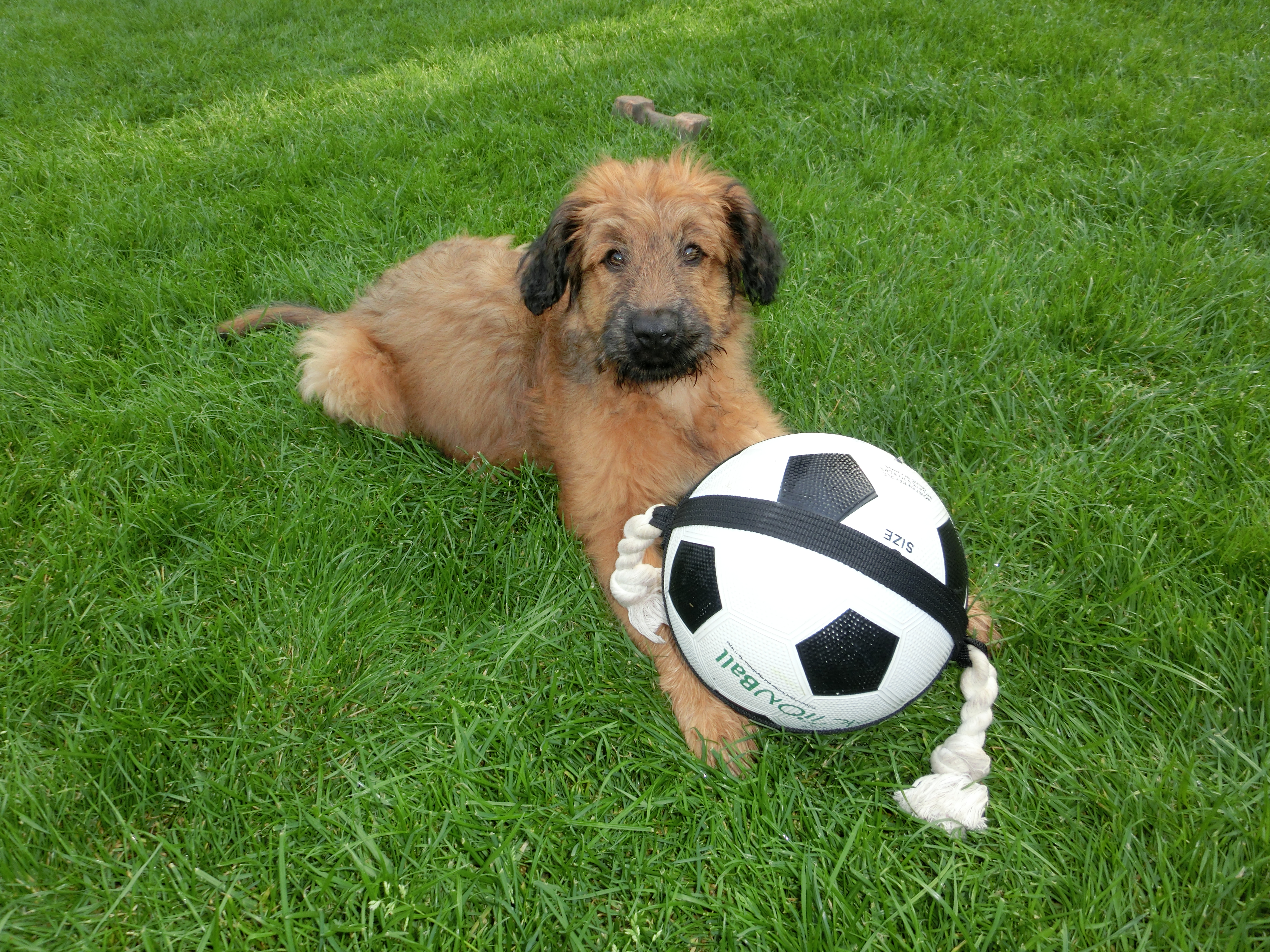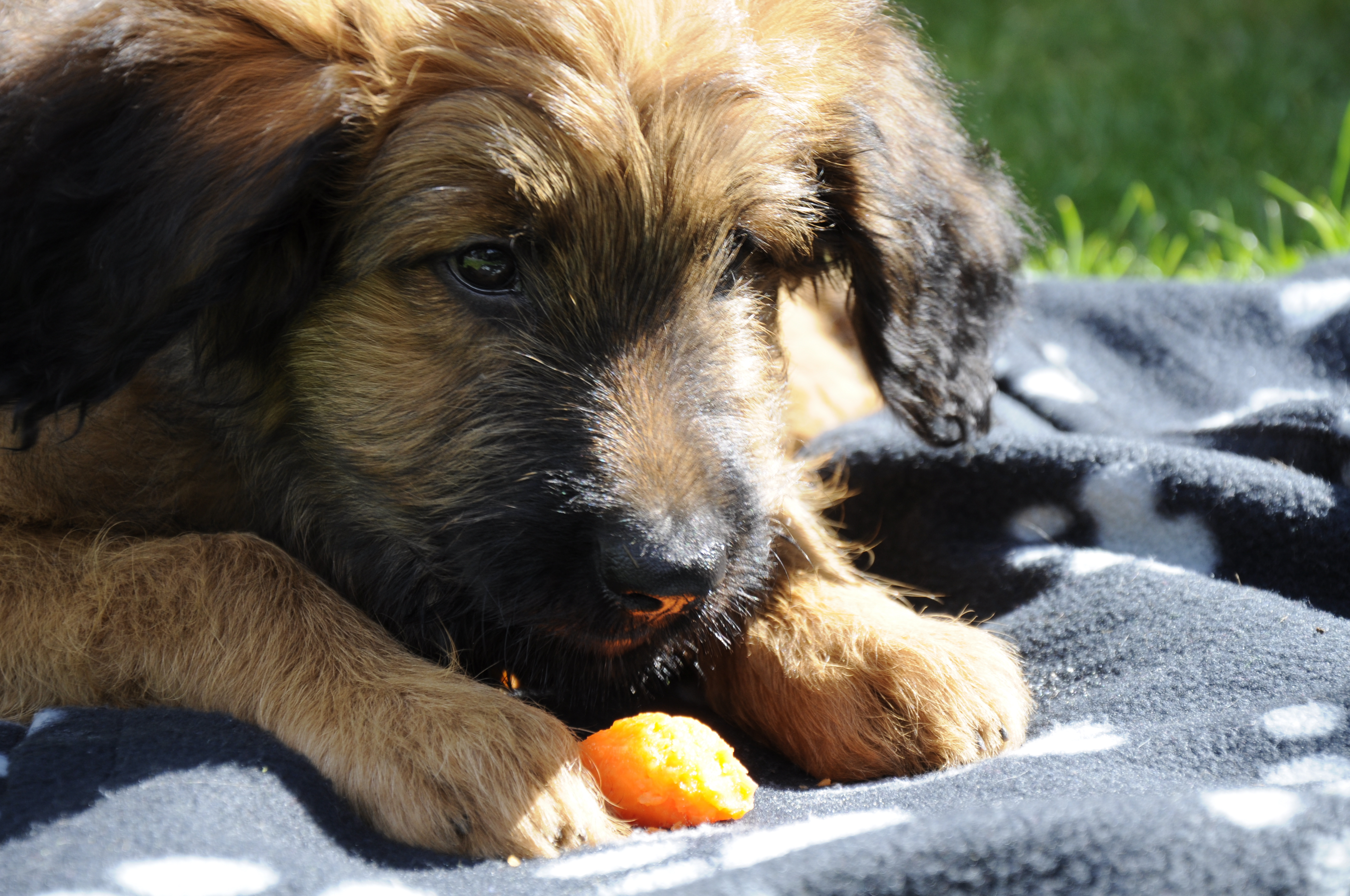 wollte mal wieder von mir berichten.Mir geht's toal gut,werde von allen geliebt und geknuddelt, außer wenn mein Übermut mit mir durch geht, dann sind Frauchen und Herrchen nicht so begeistert,hab sie dabei schon in Nase und Ohr gezwickt (auwa).Wenn meine Leute auf Arbeit sind holen mich und Elli Oma und Opa zu sich.Die halte ich dann ganz schön auf Trapp. Opa versucht immer das schönste Foto von mir zu machen und von Oma gibt's Möhrchen.Hab auch schon viele neue Hunde Bekanntschaften gemacht.Vor kurzen war ich beim Tierarzt zum impfen, war gar nicht schlimm.Die Ärztin war begeistert, da sie auch nicht sehr oft einen Briard sieht.Ich wiege jetzt so 10kg und wachse und wachse jeden Tag ein Stückchen mehr.Hunger hab ich immer, darf aber nicht immer alles fressen was mir in den Mund läuft! So jetzt schicke ich Euch noch ein paar Bilder von mir, lasst es Euch allen gut gehen Ihr Wautzi's aus dem G -Wurf. Ach und Goofy Dein Bild neben dem Rucksack ist echt zum kaputt lachen.Bis bald Eure Greta.
