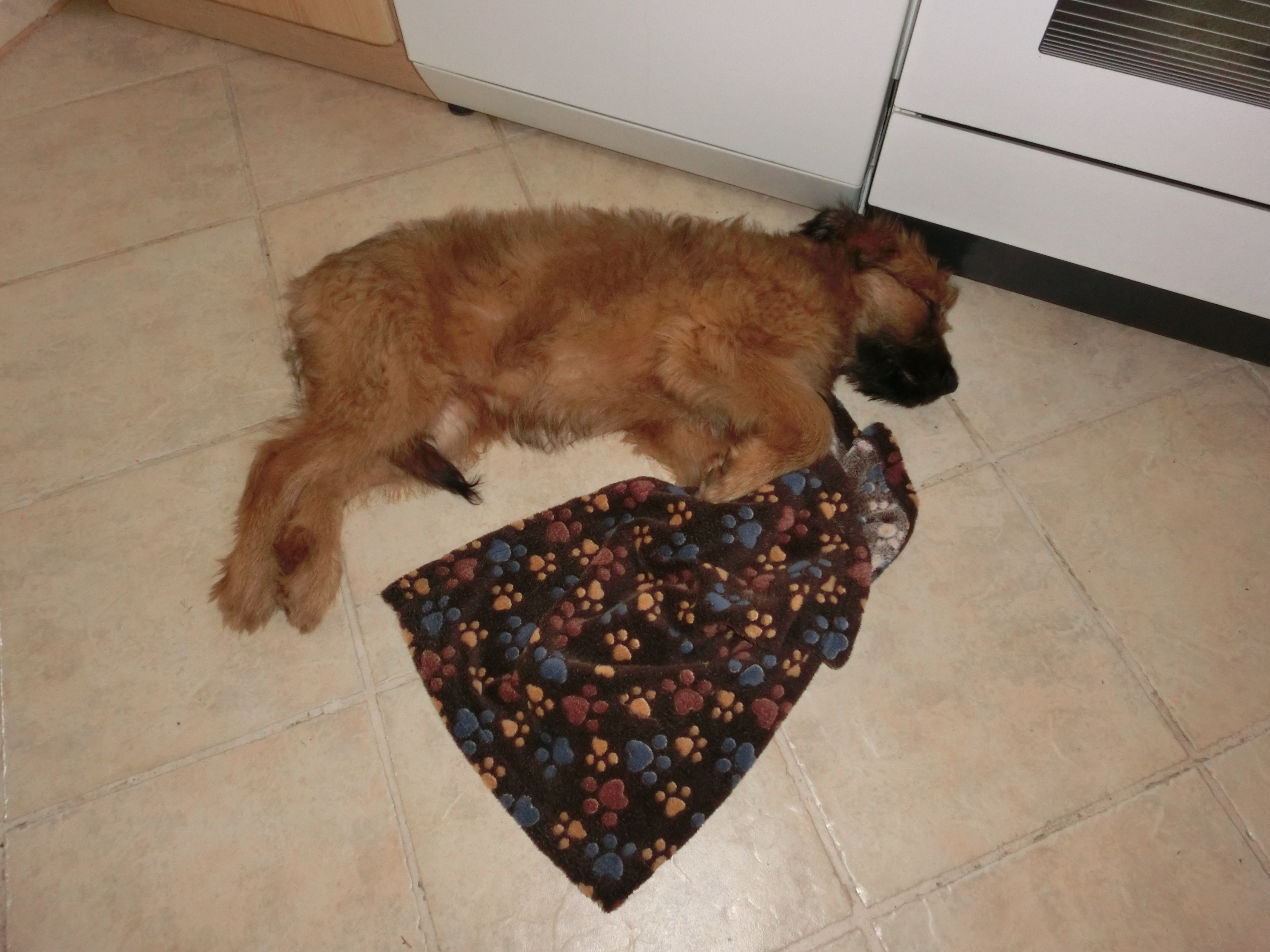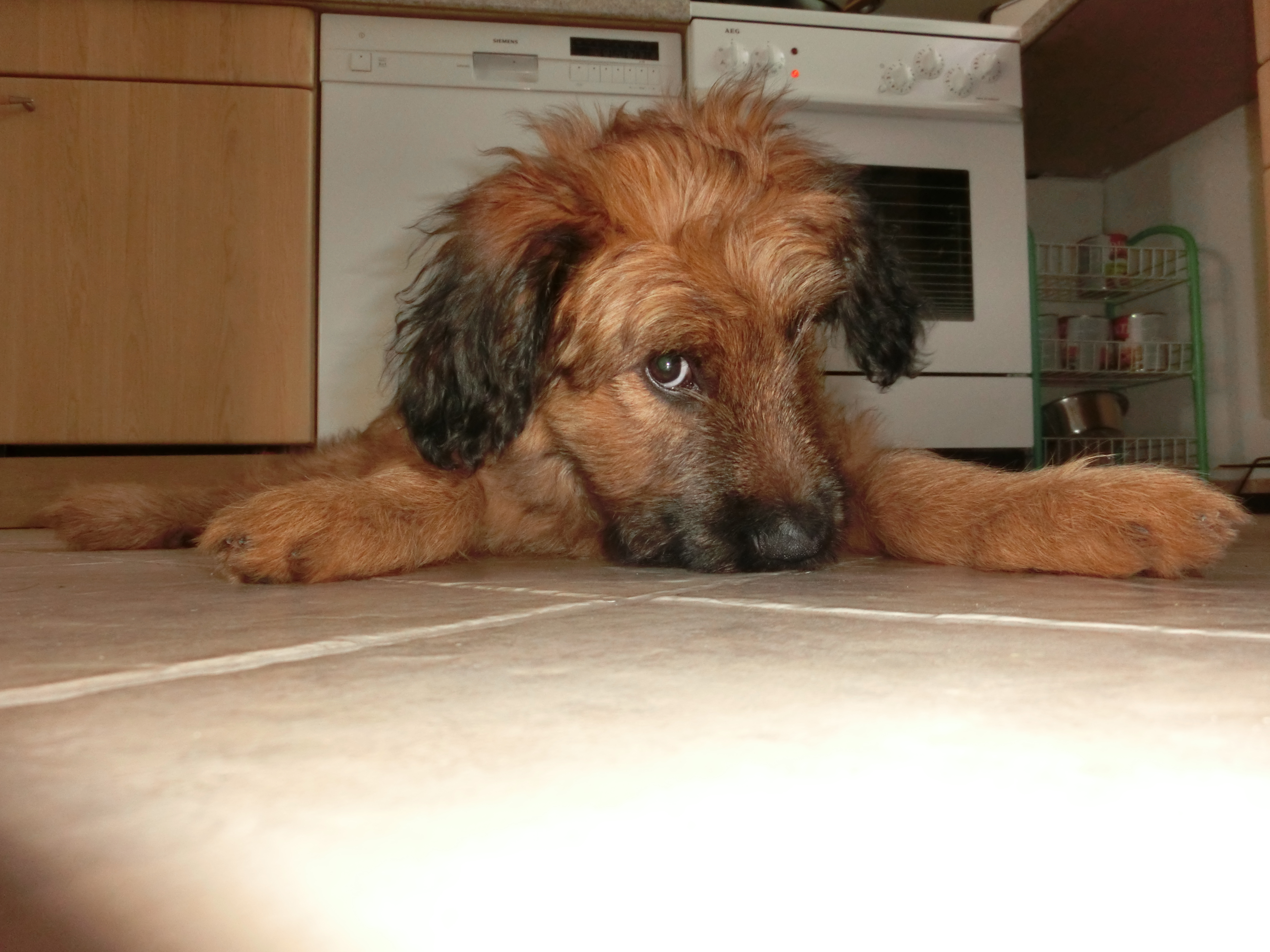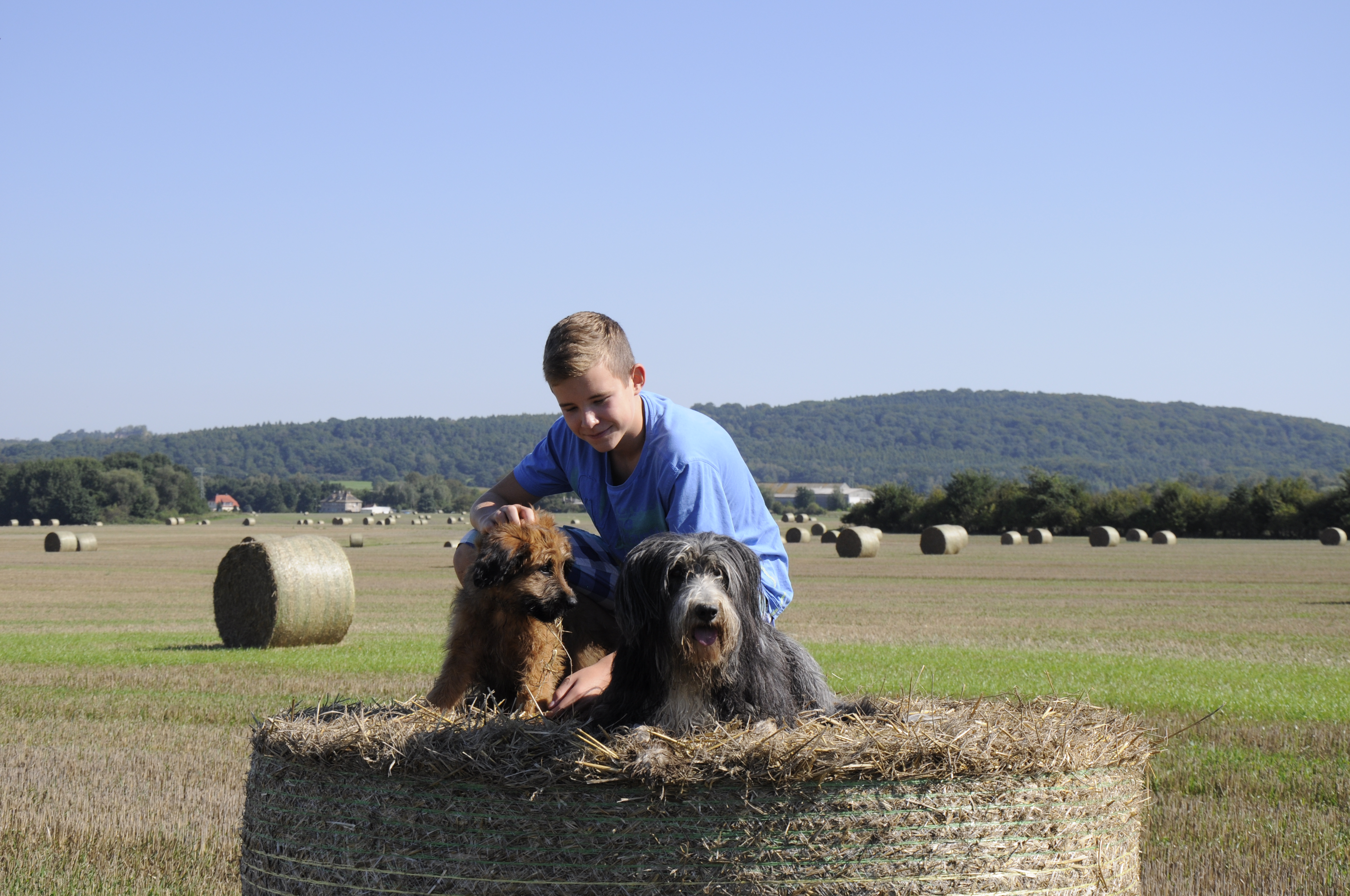 wollte mal wieder von mir berichten.Mir geht's toal gut,werde von allen geliebt und geknuddelt, außer wenn mein Übermut mit mir durch geht, dann sind Frauchen und Herrchen nicht so begeistert,hab sie dabei schon in Nase und Ohr gezwickt (auwa).Wenn meine Leute auf Arbeit sind holen mich und Elli Oma und Opa zu sich.Die halte ich dann ganz schön auf Trapp. Opa versucht immer das schönste Foto von mir zu machen und von Oma gibt's Möhrchen.Hab auch schon viele neue Hunde Bekanntschaften gemacht.Vor kurzen war ich beim Tierarzt zum impfen, war gar nicht schlimm.Die Ärztin war begeistert, da sie auch nicht sehr oft einen Briard sieht.Ich wiege jetzt so 10kg und wachse und wachse jeden Tag ein Stückchen mehr.Hunger hab ich immer, darf aber nicht immer alles fressen was mir in den Mund läuft! So jetzt schicke ich Euch noch ein paar Bilder von mir, lasst es Euch allen gut gehen Ihr Wautzi's aus dem G -Wurf. Ach und Goofy Dein Bild neben dem Rucksack ist echt zum kaputt lachen.Bis bald Eure Greta.