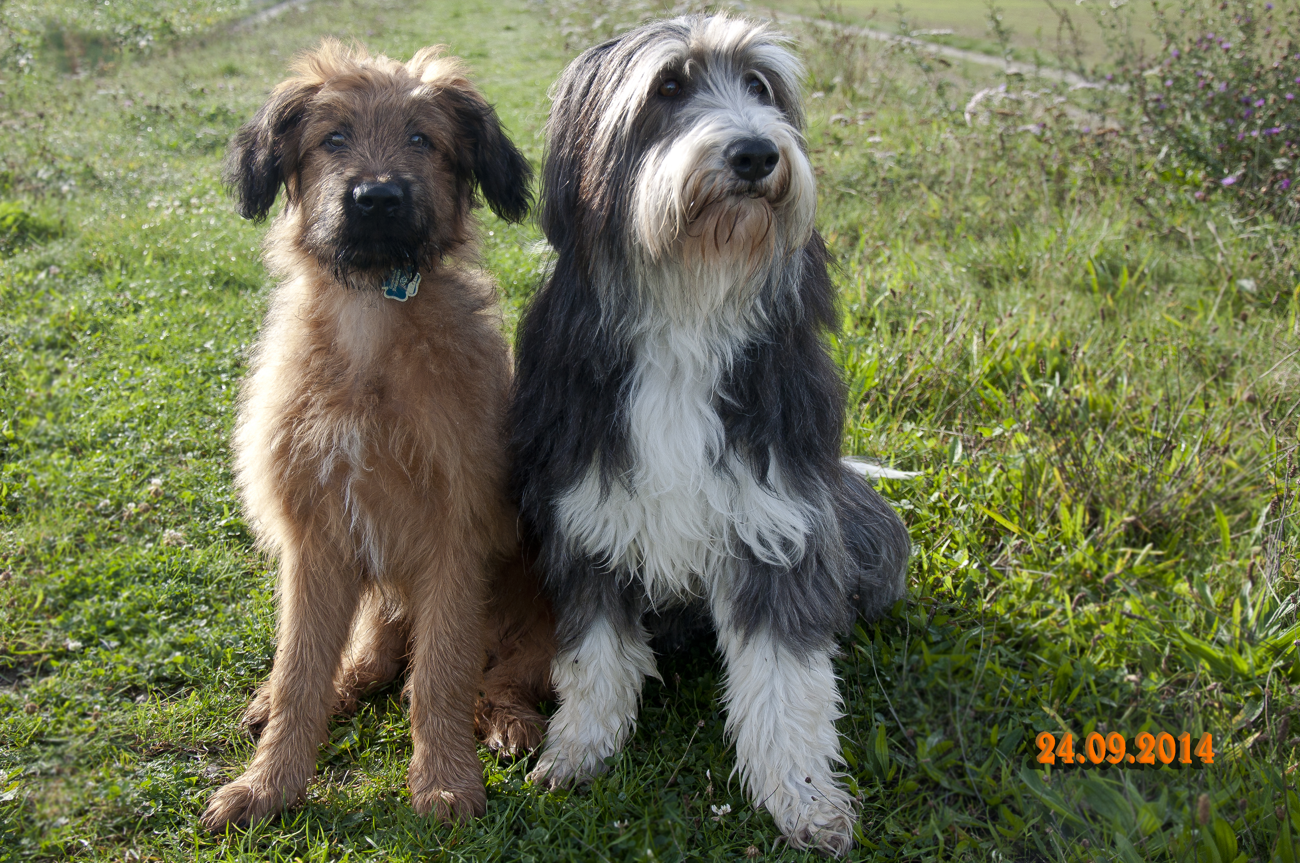 Hallöschen,wollt mich mal wieder melden.Mir geht's supi,wachse und gedeihe,die ersten neuen Zähne sind schon gekommen,bin fast so groß wie meine Mitbewohnerin Elli ( Bilder Folgen).Ich geh jetzt in die Hundeschule das macht auch richtig Spaß, vieles kenne ich schon von meinem ersten zu Hause, da haben die anderen Kumpel manchmal ganz schön Angst davor(Tunnel oder über ne Plane zu laufen) aber ich bin ja ein mutiger Hund! Schwimmen kann ich auch schon,beim Tierarzt war es auch nicht schlimm muss aber erst in einem Jahr wieder hin.Die haben sich auch gefreut mal einen Briard zu sehen.Im großen und ganzen sind alle happy mit mir und wir haben viel Spaß zusammen.Ich würde mich auch sehr freuen mal etwas von meinen Geschwistern zu hören und zu sehen wie ihr alle gewachsen seit. Meldet Euch doch mal.Liebe Grüße Eure Greta.