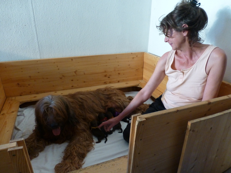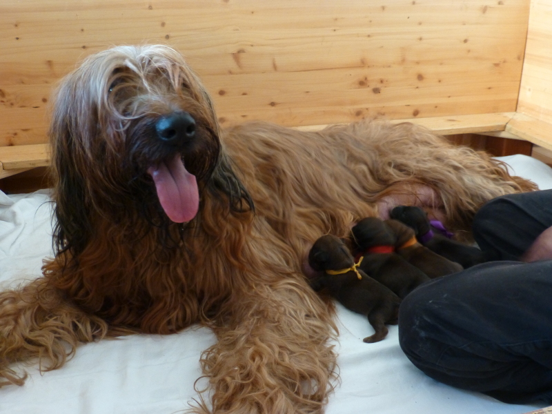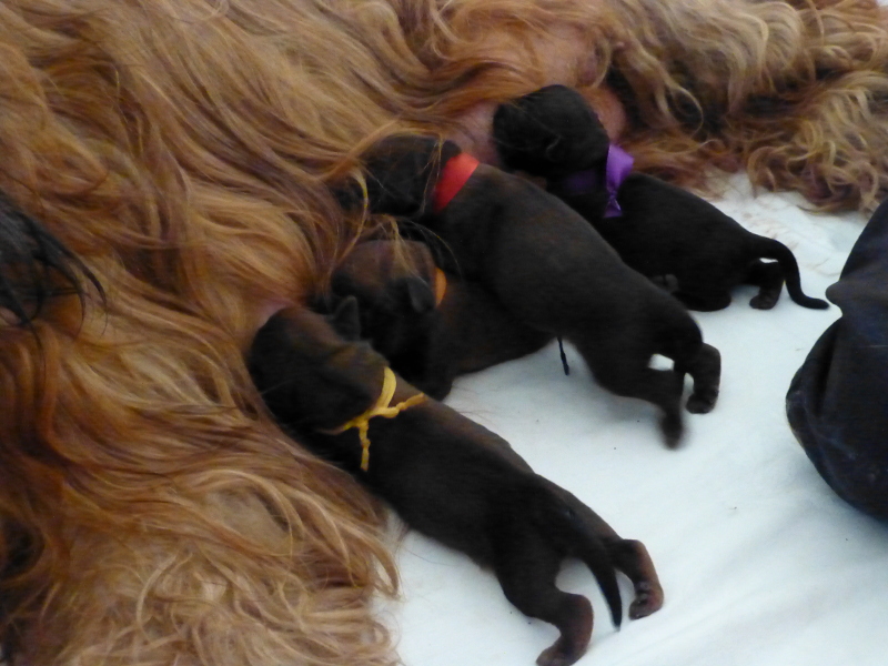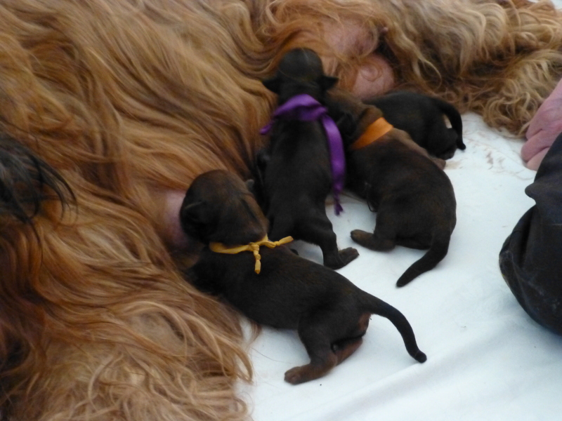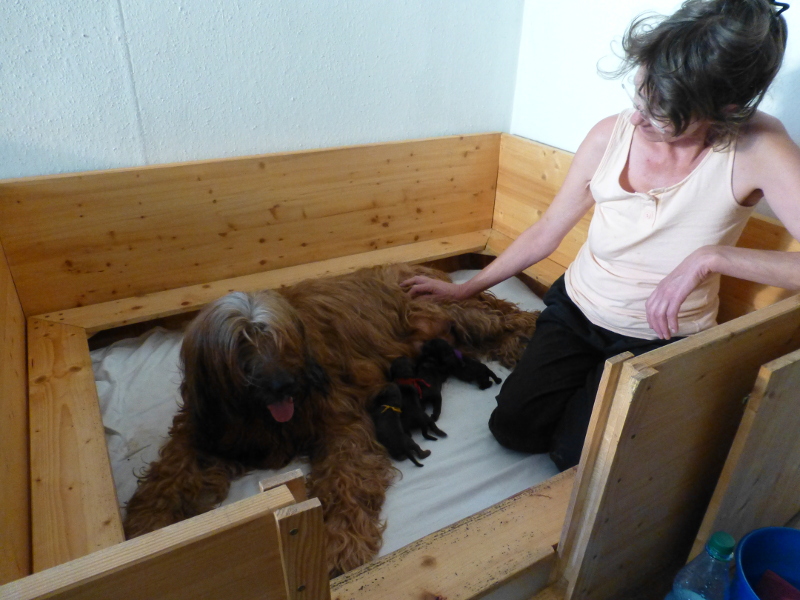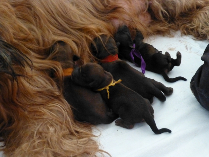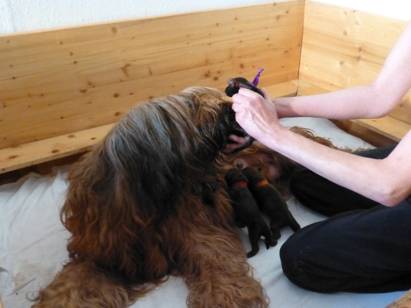 Binnen zwei Stunden war heute früh alles erledigt – so schien es, und wir konnten es nicht glauben, da ja sechs Welpen im Ultraschall gesichtet worden waren. Tatsächlich setzten am späten Nachmittag noch einmal Wehen ein, und es wurden zwei weitere Welpen geboren, aber leider tot. Das kommt vor, ist traurig, aber wir können uns darüber freuen, wie die vier Mädchen um die besten Zitzen rangeln. (Als wenn die Auswahl nicht groß genug wäre, mit neun Zitzen, die Clarissa seit jeher in Betrieb hat.)