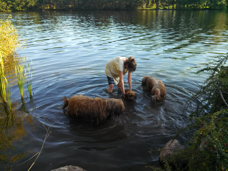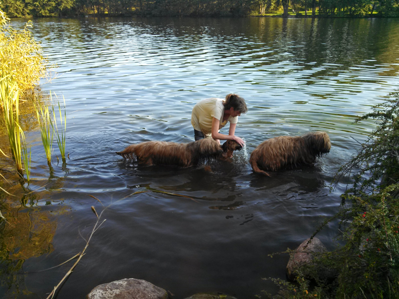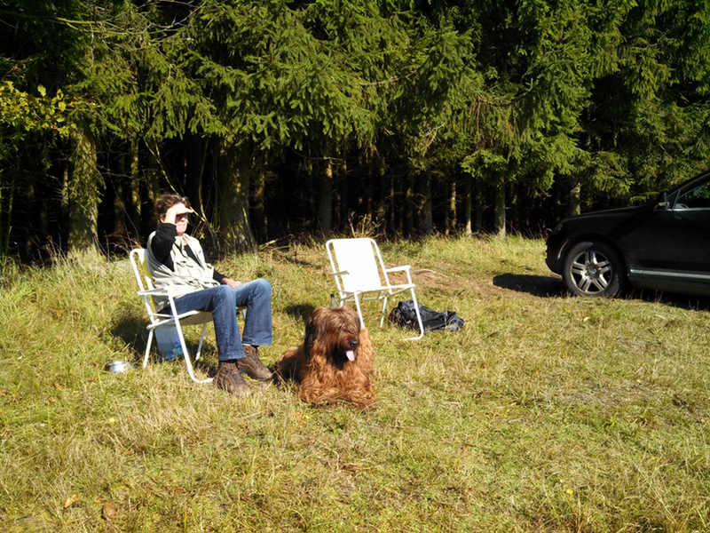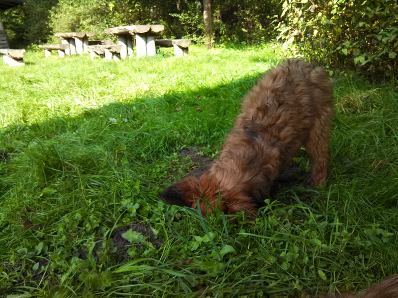 Garbo geht es heute schon etwas ruhiger an als gestern. Den gestrigen Tag haben wir ähnlich verbracht, auf einer romantischen Lichtung gesessen, welche einmal der Anger eines seit nunmehr hundert oder hundertfünfzig Jahren verlassenen Dorfes war, mitten im Wald. Garbo war hin und weg, nicht wegen der Romantik des Ortes, sondern weil sie dort nach Herzenslust Löcher buddeln durfte. Am Abend wurde sie dafür an der nämlichen Stelle im See gebadet. Und überhaupt kam sie den ganzen Tag nicht zur Ruhe, war völlig überdreht, konnte einfach nicht aufhören und war am Abend total erschöpft.