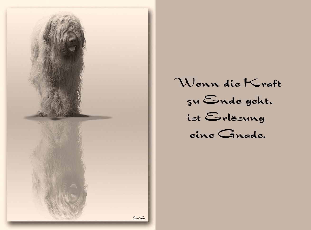 Wir erinnern uns trotz der traurigen Nachricht mit Freude an unsere Begegnungen mit diesem schönen, großen Rüden. Keinen Zentimeter wollte Asasello seinem Herren von der Seite weichen, wir kennen beide nur absolut unzertrennlich, und alles andere schien Asasello kaum wichtig zu sein. Das war eine ganz besondere Hundeliebe.