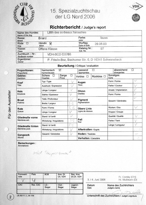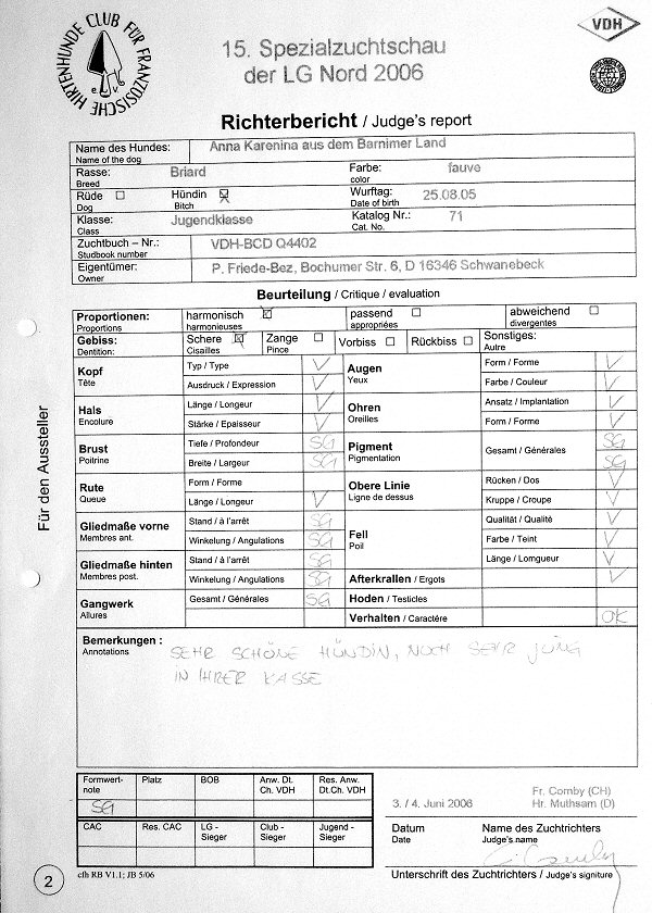 Anna Karenina ist auf der CFH-Zuchtschau in Wietzen in der Jugendklasse angetreten und hat "sehr gut" abgeschnitten. Die Bewertungen sind wie erwartet. Wie man sieht, fehlte es beim Laufen noch etwas an der gebotenen Ernsthaftigkeit.