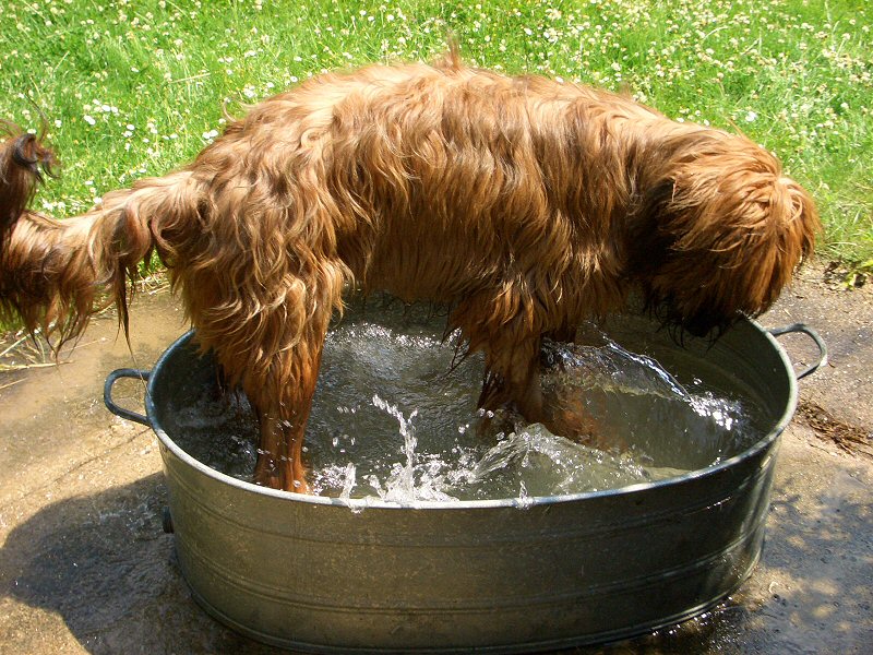 Wir waren gerade aus Belzig </weblog/weblog:1151242821:566622.html> zurück und das Thermometer zeigte 35 Grad. Wir stellten unseren Hunden eine Badewanne in den Garten.