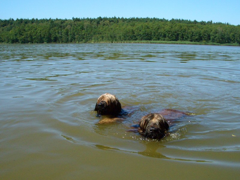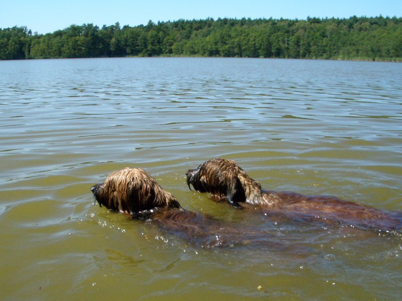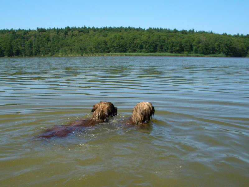 Lilith schwimmt auch allein ihre Runden, aber ich gehe immer nur so weit, wie ich Boden unter den Füßen habe. Der Weserhund hat sich darüber schon amüsiert. Lilith hat sich zwar immer viel Mühe gegeben mir zu zeigen, wie man schwimmt, aber darauf wollte ich mich nicht einlassen. Schließlich bin ich als junger Hund mal untergegangen </weblog/1157284741:903434.html>, das habe ich noch nicht vergessen. Weil die Menschen aber heute mit in den See gingen, habe ich mich auch getraut. Na also! Und unsere Menschen sind jetzt ganz zerkratzt.